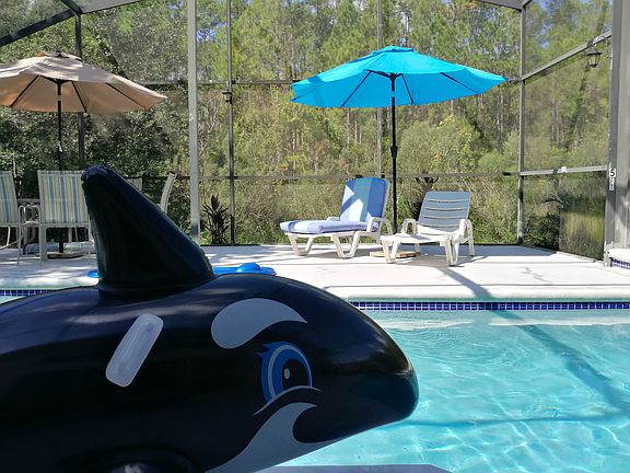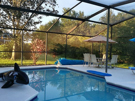 MOVE-IN READY. Zoned for SHORT or LONG TERM RENTAL Wonderful FAMILY-friendly FURNISHED POOL Home to be used as a turn-key rental, 2nd home/vacation or live it full time! LOW HOA. Well maintained home with 4 bedrooms, 2.5 baths and HEATED POOL/SPA. Fully equipped kitchen has eat-in space. As a vacation home it provides sleeping accommodations for eight, two living rooms and master bedroom downstairs. Spacious screened pool/spa deck area faces an EPA protected conservation area providing added PRIVACY. Located on an OVERSIZED LOT in the desirable and quiet neighborhood of Westridge in Davenport, close to Disney and other theme parks, restaurants, shopping, recreation, major roads and more. MUST SEE. Room measurements are approximate.