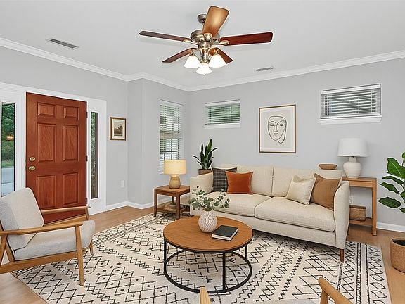 A charming, covered front porch invites you into a bright and airy living room featuring a cozy fireplacean ideal retreat after a long day. The galley-style kitchen flows effortlessly into the dining area, creating a warm, open-concept space that's perfect for both everyday living and entertaining.