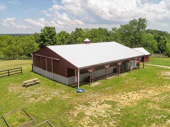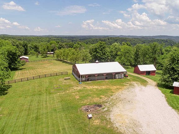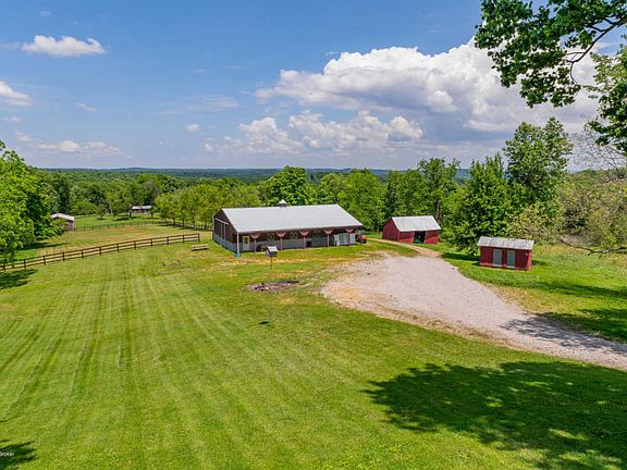 Absolute nature lover's paradise! This scenic property overlooks the valley below with views of Thunder over Louisville, the Louisville skyline, and even the jumbo-tron at Churchill Downs. Tons of privacy as property backs up to nature preserve. 3 stall horse barn, outbuilding workshop with electricity and plumbed for bath, chicken coop, 2 storage sheds, and even a historic log cabin. Hardwood floors throughout first level with vaulted ceiling in living room. Possibility of 2nd master bedroom on main level. Closet space is not a problem with large storage closet in hallway and walk in closets in first floor bedrooms. Finished walkout basement with large family room perfect for entertaining. Maintenance free wrap-around deck overlooks the gorgeous scenery. 2 electric water heaters. One bath One bathroom also has walk in shower that is handicap accessible. Easy commute to Louisville, just hop onto 64 and you're in downtown in 20 minutes. Make an appointment to truly experience the beauty this home and property have to offer.