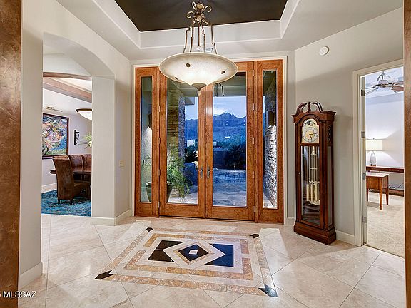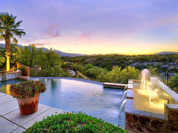 Exquisite custom home with panoramic city & mountain views and premier upgrades. Set atop a 1.56-acre ridgetop lot, this stunning 2006 custom-built residence offers sweeping, unobstructed views of the city skyline and surrounding mountains. A brick paver driveway leads to a charming courtyard entry, opening into a dramatic foyer with soaring ceilings, expansive windows, and breathtaking vistas from nearly every room. Inside, timeless luxury meets modern comfort. Elegant 24-inch travertine tile floors, coffered ceilings, and a gourmet chef's kitchen featuring granite countertops, stainless steel appliances, a professional-grade gas range, and solar shade screens on most windows, create a space that is both beautiful and functional. The spacious primary suite is a true retreat boasting a steam shower and high-end finishes. Meticulously maintained and thoughtfully enhanced, this home showcases a long list of recent upgrades, including: fully owned solar system (2024) for exceptional energy efficiency; new HVAC systems (2022), dual air conditioners, furnaces, and water heaters; high-end theatre sound system in the family room for immersive entertainment; fresh exterior paint (2024) and interior paint (2025) for a modern, polished look; new carpeting (2021) in the family room, primary suite, and walk-in closet; backyard oasis remodel (2021): new landscaping, granite bar, built-in grill with stacked stone surround and LED lighting, stacked stone fireplace and spa accents, plus low-maintenance artificial turf; Enviro System Whole House Water Conditioning for superior water quality. Located in the Catalina Foothills School District, this home offers the rare combination of refined desert living with no HOA and convenient access to premier shopping, dining, golf, and amenities. This is more than a home, it's a lifestyle. Don't miss the opportunity to own a luxurious, energy-efficient property in one of Tucson's most desirable settings.