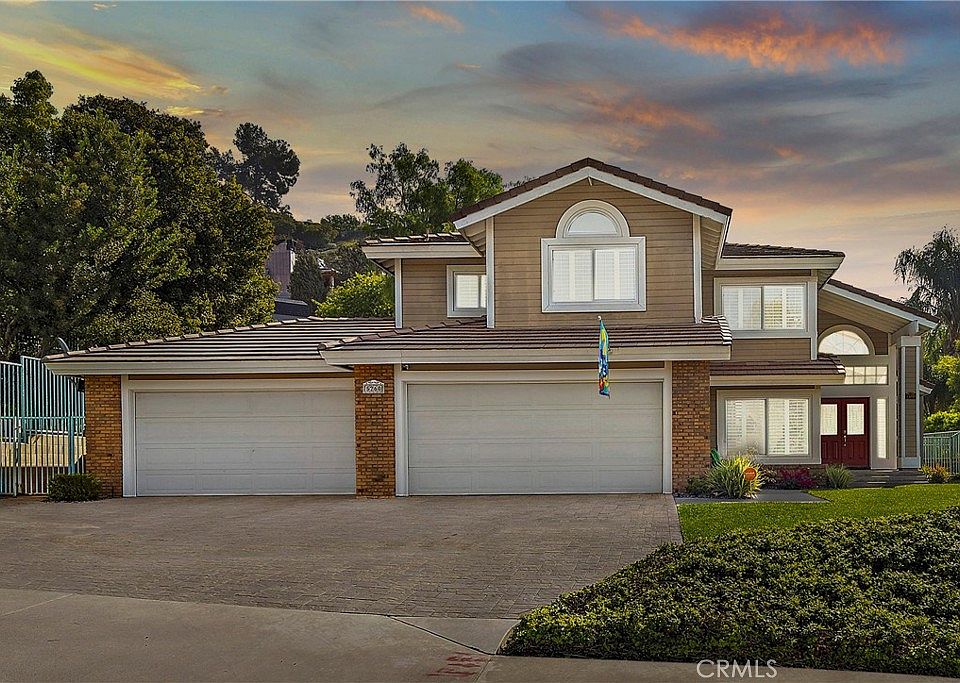 LIGHT and BRIGHT, two-story pool home with 4 bedrooms, 3 bathrooms, and 2,557 square feet of living space. This Yorba Linda home is perfect for entertaining and allows privacy when needed. Situated on a lush oversized 13,500 square foot lot, featuring a glistening blue pool and spa, stainless-steel outdoor barbeque, and a four-car, direct access garage with plenty of driveway parking, this home has it all. Upon entering through the double-stain glassed doors you are welcomed by an open floor-plan living and dining room with soaring cathedral ceilings, large windows with plantation shutters, a focal point fireplace, and views of the serene backyard & sparkling pool through the double glass doors. The gourmet kitchen sits adjacent to the dining room and opens up to the family room allowing for seamless entertaining. The kitchen is extra spacious with granite countertops, gorgeous raised panel cabinets, a gas cooktop kitchen island, and a wine refrigerator. The slider out to the back makes dining al fresco a breeze. The main floor bedroom is complete with a full bath, ideal for guests. The primary bedroom with an en-suite bathroom features a walk-in closet, dual vanity sinks, a separate shower and soaking tub, and a retreat - a space ideal for unwinding, reading, or exercising! 2 additional large bedrooms and a shared hallway bath complete the upstairs accommodations. Last, but not least, the home includes paid-in-full solar panels and a water-softening system. Located near parks,