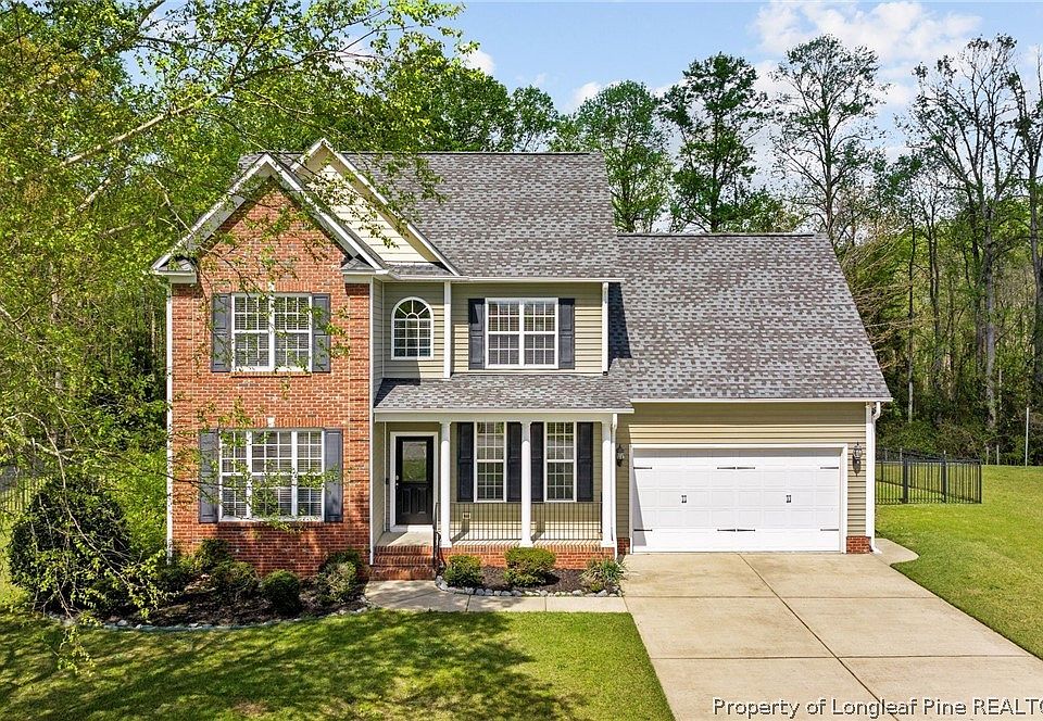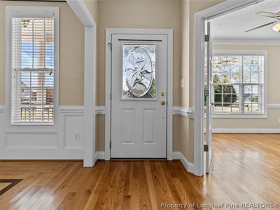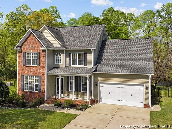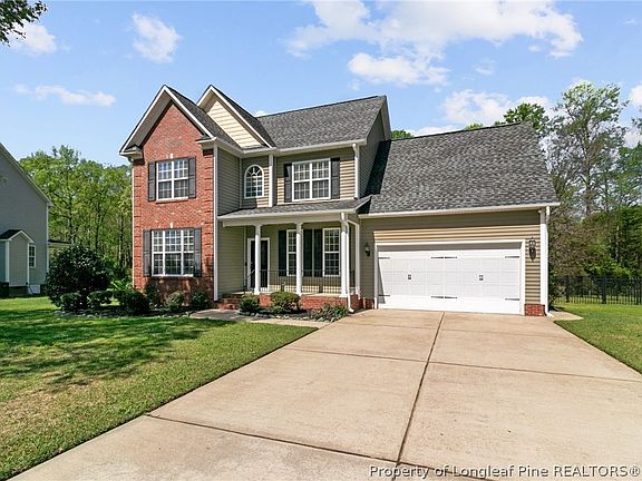 Amazing home in quiet neighborhood. This home features open floor plan with formals, huge primary suite and two additional bedrooms upstairs along with bonus room that could be used a a large 4th bedroom. Entrance to the home is very welcoming with large foyer, beautiful hardwoods w/custom inlay in formal dining room to the right. Office or formal living room to the left thru french doors; large great room w/gas log fireplace. large kitchen w/upgraded granite counters and plenty of cabinet space; breakfast bar joins the eat-in area w/bay window and great room; primary suite w/double tray ceiling, double vanity, jetted tub, separate shower and large walk-in closet; fenced backyard, with woods behind the yard offering privacy; Nicely landscaped w/irrigations system, one HVAC replaced in 2017; Newer carpet and interior paint throughout and central vacuum system. Located near schools, shopping. A quick 20 minutes to Fort Liberty and less than an hour from Raleigh. Come tour your new home!