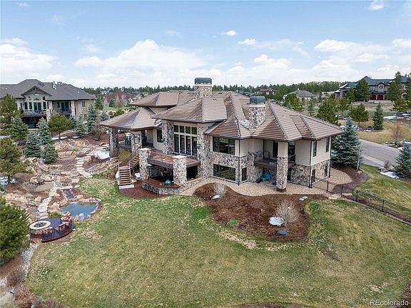 Gorgeous 2 Story Estate w a Great View of Pikes Peak. Located in the Prominent community of Timbers at the Pinery on a quiet Cul-de-Sac on 1 Acre. High-end Custom Home features 5 Beds, 8 Baths, Finished Walk-out Basement, Rare 1,710 SqFt Finished 6 Car Attached Garage & Impressive Outdoor Living spaces. Prestigious Home w a Blend of Sophistication, Elegance & Comfort throughout. Fantastic Street appeal & a Lovely Foyer invites you in to a Bright, Open Home providing a Great Floorplan & Detailed Custom Finishes. Great Room offers Abundant Natural Light & a Stone Accent Wall graced w a Fireplace & access to an Expansive Trex Deck overlooking Waterfalls flowing into a pond, & beyond to Beautiful Mountain Views; Perfect for Relaxing & all your large & intimate Gatherings. Elegant, Formal Dining w adjacent Butler’s Pantry. Spacious Gourmet Kitchen boasts Marble Slab Counters, Island, High-end Appliances, Beautiful Cabinetry, Walk-in Pantry, Breakfast Bar Seating & a Sunny Breakfast Nook w Deck Access. Adjacent Hearth Room w a Fireplace; great place to keep the Chef company. Main Level boasts Executive-style Office enhanced w a Floor to Ceiling Stone Fireplace, Wet Bar, Deck Access. Elegant Primary Retreat has a Sitting area, Lovely Views, Fireplace, Deck access, Huge Walk-in Closet & Luxurious 5-Piece Bath. Equally Impressive is the Walk-out Basement offering a Family Room w Fireplace, Game Room, Exceptional Wet Bar, Wine Tasting Room & access to a Covered Patio & Fabulous Outdoor Kitchen. Upstairs is a Loft w Dry Bar & Deck access, 2 Beds w Walk-in Closets. All Beds have en Suite Baths. 2 more Basement Bedrooms & Guest Bath. Main Level Laundry Room, Mud Room & 2 Powder Baths. Tile Roof, Stucco Exterior, South Facing Garage, Off-street Guest Parking. Outdoor Living at its Best! 2 Rivers, Waterfalls, Pond, Firepit, Mature Trees & Volleyball Court. Close to Parks/Trails, Schools, Golf, CO Horse Park. Easy access to Hwy 83, Parker, Shopping & Dining. See Virtual 3-D Tour.