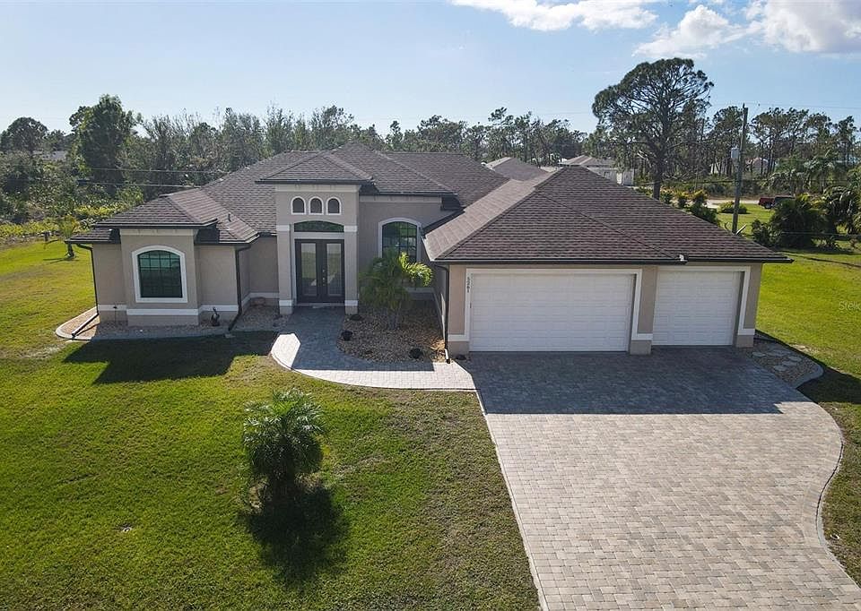 Thinking about building but don't want to wait. **Oversized garage (30x30) with mini-split A/C and finished floor** Come home to elegant Florida living in this amazing pool home situated on a double lot. Curb appeal abounds with the paver driveway leading to this Mediterranean themed home. Upon entering you know that this is where you can entertain in style or just enjoy precious time with family. This home offers luxury and comfort, with first class finishes. The view from the living room through the 8ft sliders to the expansive lanai and pool is beyond mesmerizing. You have tile throughout the living areas, large great room and family room, master suite oasis with incredible walk-in shower, generously sized guest bedrooms. The hallway configurations add flow and space, soaring ceilings will appeal to the decorator, as well as crown molding and tray ceilings. Cooking will be amazing in the gourmet kitchen, 42” crowned cabinets, and slate appliances. The large lanai features a heated saltwater pool with a variable speed pump. This house also features impact resistant windows throughout, spray foam insulation for the whole home including garage, oversized garage (30x30) with mini-split A/C and finished floor, paver drive and lanai, custom curbing with mature landscaping, whole house water softener, prewired for generator, and more. Whether you are just enjoying the serine setting at home, playing one of the many area golf courses or enjoying the nearby beaches this home offers the Florida lifestyle as it was meant to be. Gulf Cove also offers a private boat ramp to The Myakka River and park for members of the HOA.