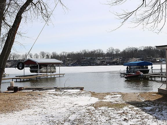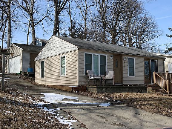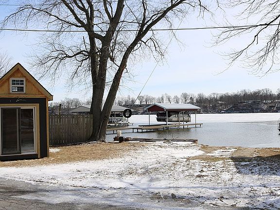 Well kept (small cabin) with large kitchen, 2 car det garage; chicken coop up above; flat lake side lot;