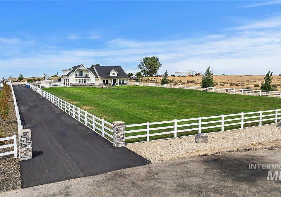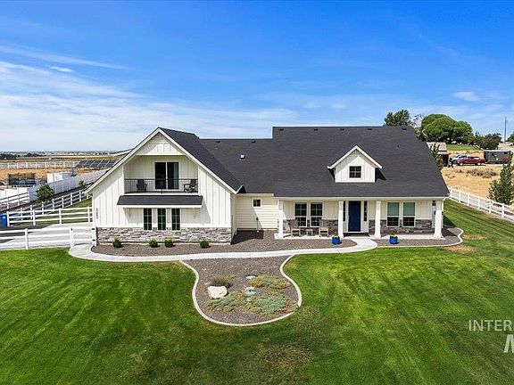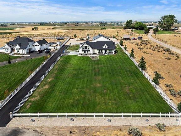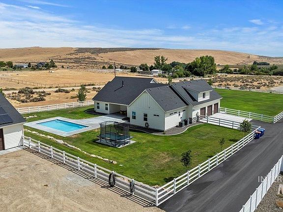 Escape to the tranquil Kuna countryside in this exquisite custom-built estate, a true masterpiece nestled on a spacious 2-acres. Enjoy breathtaking views in every direction, luxurious finishes, and a serene setting that will captivate your senses. Step inside and be greeted by beautiful wood floors, custom cabinetry, granite countertops, and designer fixtures throughout. The gourmet kitchen seamlessly flows into the spacious dining and great room, creating a perfect gathering space for family and friends. Spend your days lounging by the pool or indulge your hobbies in the 50x70 custom shop, a dream space for car enthusiasts, woodworkers, or anyone needing ample room for projects and storage. This home also offers the possibility of generational living with a separate upstairs apartment featuring its own kitchen, living room, private balcony, bathroom, and bedroom. Fully owned solar panels contribute to energy conservation and help keep power expenses at a minimum. Schedule your private showing today!