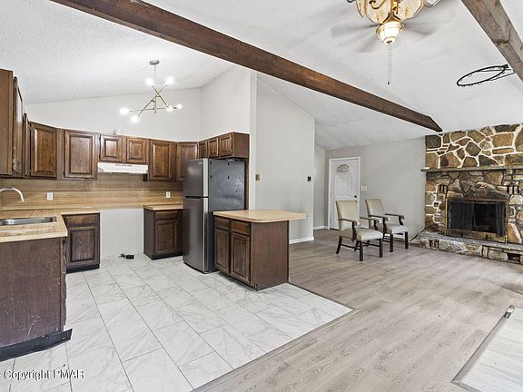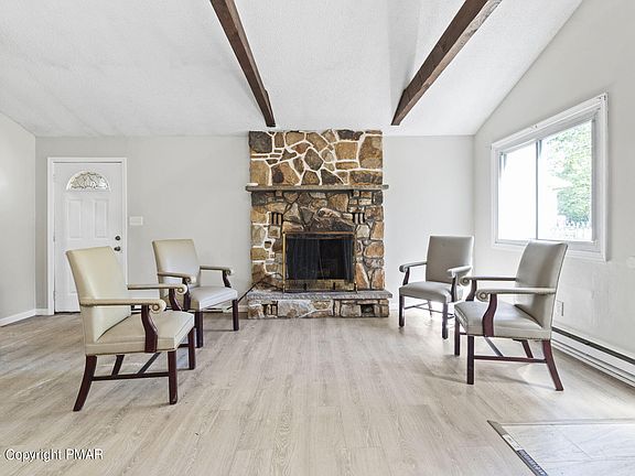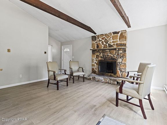 As you enter this charming 3 bed, 2 bath residence located in A Pocono Country Place, you'll be greeted by a spacious living area featuring a stone fireplace and exposed beams, creating a cozy and rustic ambiance. The open eating area flows seamlessly into a lovely kitchen with ample cabinet space and a convenient breakfast bar. The primary bedroom is a serene retreat with an ensuite bath featuring a stand-up shower. A second large bedroom, equipped with a ceiling fan, provides additional comfort and convenience. The third bedroom boasts an oversized closet, perfect for all your storage needs. The home also includes a second full bath with a shower-tub combination. An in-unit laundry area provides additional convenience to this home. A versatile den/bonus room with abundant windows and a private entrance offers endless possibilities. Whether you envision it as a media room, game room, office space, or even an additional bedroom, this space can be tailored to your needs.