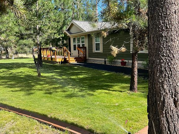 Beautiful 2019 manufactured home on a fenced 1-acre corner lot in La Pine, offering privacy, space, and thoughtful upgrades. The property features a 28' x 25' deep steel carport, 480 sq ft deck perfect for entertaining, and mature trees creating a peaceful setting. An asphalt driveway, resealed in August 2025, leads to the home, with a 200 sq ft storage shed & a 50 amp RV hookup w/ water for added convenience. Inside, enjoy two spacious living rooms, a cozy wood-burning fireplace, built-in shelving, & rich hickory cabinets throughout. The kitchen is open & functional, ideal for hosting or everyday living. Primary separation w/a walk-in closet, double vanity, & a deep soaking tub framed in hickory. Underground sprinklers keep the yard lush & green all summer. This home combines comfort, functionality, & charm-perfect for full-time living or relaxing getaway near Newberry Caldera, Deschutes National Forest, and East & Paulina Lakes!
