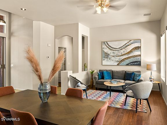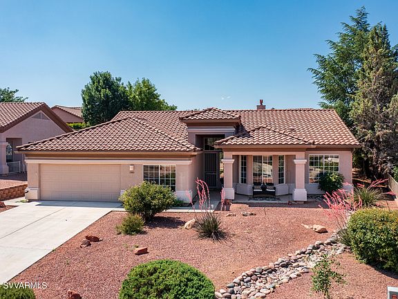 Elegantly upgraded home in Verde Santa Fe nestled on a quiet cul-de-sac . Split floor plan with 3BR, 2 BH, plus a den/office at 1867SF. A sense of harmony and balance await you in this well designed home full of natural light and 10' ceilings. The kitchen has a bay window with solid surface countertops and newer stainless appliances. The primary suite has an abundance of space and light with another bay window and access to the private flagstone patio. Two guest rooms plus an additional space for your office or study. An enchanting home in a peaceful setting, this home will welcome you the moment you walk through the front door. Residents enjoy the amenities of Verde Santa Fe's luxurious clubhouse, community gathering place, pool, hot tub, barbecue, exercise and billiard room. 18 hole golf course available. Conveniently located for shopping, antiquing, medical facilities, hiking, wineries, historic Old Town Cottonwood, Jerome and Sedona. Come and be captivated by the resort style living that is Verde Santa Fe.
