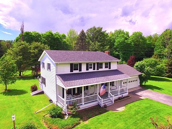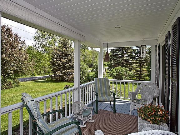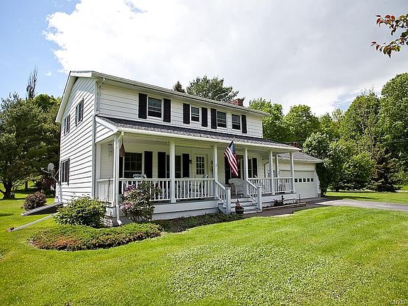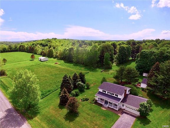 Situated in the middle of a beautiful 5.23 acre setting just outside the village of Morrisville, this well-maintained Colonial offers an inviting feel from the wide rocking chair porch to the interior floor plan with an emphasis on openness. Kitchen has the modern touches with stainless steel appliances and concrete countertops which include a convenient breakfast bar. Open dining area with slider to back deck is full of natural light and flows into the family room. On the opposite side is the living room with hardwood floors and a wood burning fireplace. There are welcoming spaces everywhere you look, even a small barn and pasture perfect for horses and other farm animals. Human residents can watch the sunsets from the roomy deck accessible from two areas. And a detached 2nd garage provides additional storage for the country living essentials. Home is here!