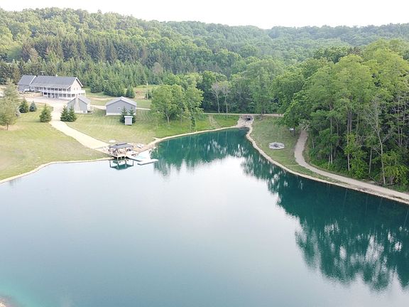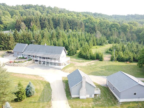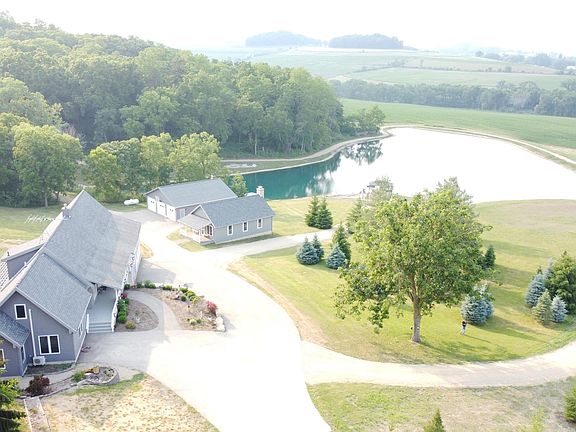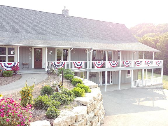 Welcome to Mirror Lake-one of the premier short term vacation rental properties in the Galena and Apple Canyon Lake area that sits on 13 +/- rolling acres with a private 2.5 acre stocked lake and incredible views of the Jo Daviess County countryside. Formerly a Christmas Tree farm, this property has been transformed into the ultimate retreat where up to 12 guests can enjoy peace and privacy just a short drive away from downtown Galena and all that it offers. The crystal clear water of Mirror Lake welcomes you from the second you pull into the driveway and approach this 5 bedroom, 3 bathroom home with nearly 4,000 square foot of living space. Immediately upon entering the home you will be greeted by an impressive kitchen highlighted by tall vaulted ceilings, granite countertops, black stainless appliances and custom Bader cabinetry made locally right in Scales Mound. Just off the kitchen is a massive great room again with tall vaulted ceilings and exposed wood beams and floor to ceiling fire place with a gas insert. Rounding out the main floor is a dining room and breakfast bar with more granite counter tops and custom cabinetry, two bedrooms, and two beautifully updated full bathrooms. An additional bedroom and an open loft area can be found upstairs while the lower level features two more bedrooms, another full bath, an additional family room, as well as tidy utility, laundry and storage spaces. There is no shortage of outdoor space or activities for guests that include a private beach and gazebo right along the lake, a fishing and swimming dock, walking paths around the entire perimeter of the lake and meandering through the remaining Spruce trees, and of course a hot tub just off the lower level walkout. If that is not enough, an 864 square foot cottage sits just across the driveway packed full of games for all ages. Additional buildings on the property include a 3 car detached garage that can be heated, and an approximately 40 X 30 pole shed. The property is being offered turn key and mostly furnished, with major updates completed in 2023 including a new septic system, a new driveway, and a residential solar array to offset electricity costs. Not interested in renting but looking for your own personal property-no problem at all the house is set up and functions equally as well for private use! There are not nearly enough words to encompass all that this property has to offer so give your agent a call and come see firsthand the beauty of Mirror Lake! 13 acres is estimated and exact acreage is TBD by survey. Additional acreage may be available. Square footage is approximate. All required rental licenses are in place with Jo Daviess County.