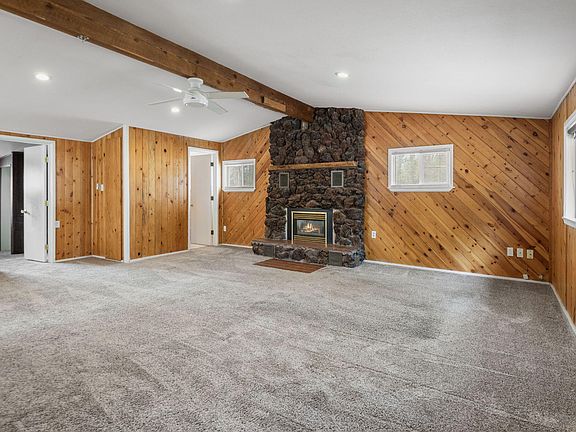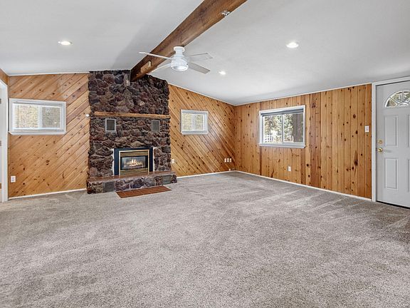 Welcome to your tranquil retreat in La Pine, OR! This charming 2-bedroom, 1-bathroom home spans 832 sq ft, nestled on a fenced 1-acre lot. Access your property via a circular driveway featuring two gates. The interior boasts vaulted ceilings complemented by a ceiling fan, enhancing the open feel. Cozy up by the stone fireplace or enjoy meals in the inviting kitchen, complete with an island. The mudroom offers extra functionality, while the knotty pine walls provide a rustic charm. With a detached garage & RV parking. Connected to City sewer and water. Located close to town and a short distance from the stunning Cascade Lakes, Mt Bachelor, Little Deschutes River, Paulina Peak, and La Pine State Park. Where you can experience all the outdoor adventures.