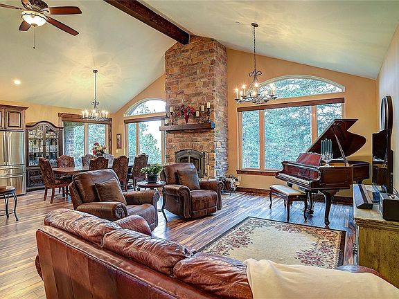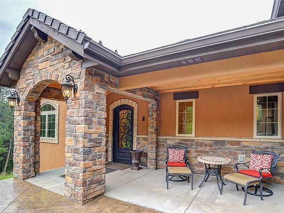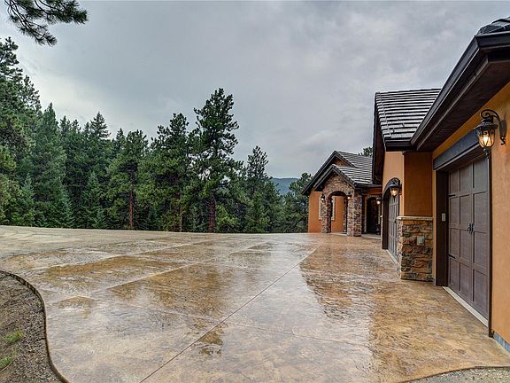 Engulfed in alpine serenity, this custom-designed home in Indian Hills is a one-of-a-kind beauty. Bordering Mount Falcon Park, this recently built, exquisite ranch features three bedrooms, three bathrooms, a main-floor executive office, high-end finishes throughout, and captivating views from every window. This tranquil escape is nestled on a remarkable twenty-acre property less than a five-minute drive to Highway 285 and less than 10 minutes to C-470. Beyond the custom-designed iron front door and welcoming foyer, find the executive study, finished with eight-foot solid knotty alder French doors, vaulted ceiling, and ultra-plush carpet. Amazonian acacia floors and Venetian textured walls grace the main level. Enter the elegant dine-in kitchen well-appointed with upgraded slab granite countertops, walnut-stained knotty alder cabinetry, Murano glass pendant lighting that hangs over the vast entertainment island, custom backsplash, a large walk-in pantry with an automatic light, an extra-deep composite granite sink with a Grohe faucet, oil-rubbed bronze finishes, and top-of-the-line energy-efficient appliances that include a dual-fuel double convection oven with a custom limestone hood. The incredible great room features a vaulted ceiling with an exposed spruce wood beam, a floor-to-ceiling stacked stone surround fireplace, a custom-crafted wood mantle, and enormous windows with captivating views of the lush surroundings. Entertain guests in the formal dining area or on the covered deck embellished with a beetle kill pine ceiling, custom iron railings, and fantastic views at every angle! The master retreat boasts a luxurious five-piece bath and a generously sized closet complete with a storage island. Inside the spa-like bath, enjoy a double-slipper cast-iron soaking tub burrowed between windows overlooking the outdoors, a walk-in shower, and polished travertine-topped cherry wood dual vanities: a true escape! A powder room and laundry room, both showcasing granite countertops, are also on the main level. Nine-foot ceilings adorn the walk-out basement flaunting an expansive recreation room and two fully conforming bedrooms. Beyond French doors, discover endless possibilities in the unfinished space, complete with an egress window! A full bathroom with brushed nickel finishes and an extra-deep tub also rests in the basement. Walk through the solid mahogany speakeasy door to reach the covered patio with stunning views of the wilderness. This property stretches well beyond what your eyes can see! Explore the twenty acres with a private-access trail to Mount Falcon Park, a seasonal creek, towering pines, and more! Out front, crushed granite gravel leads to the South-facing stamped-and-stained concrete driveway with water and a dump-ready RV pad to the right. Park with ease in the fully insulated, oversized three-car garage with trench drains and a sink! Designed to be handicap accessible, the home rests on a rock-solid granite shelf. This masterfully built home is a must-see!