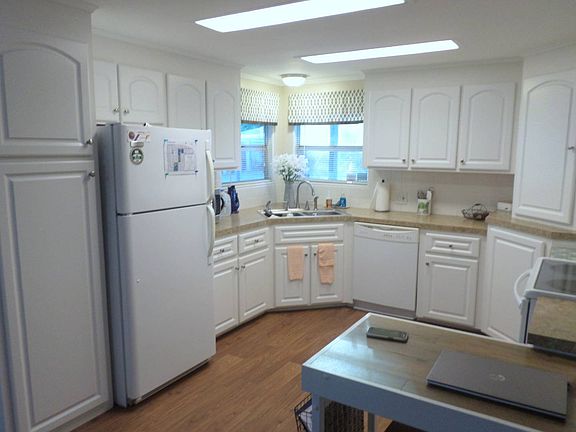 Absolutely immaculate and move-in ready! This 2 bedroom, 2 bath home is being offered unfurnished but sellers are willing to negotiate some pieces. A lovely renovation with partial drywall, updated light fixtures and electrical outlets, new kitchen and baths, plywood subfloors and new laminate, tile and carpeting throughout. Quality window treatments in the home remain. All ceilings are drywall with a flat, clean finish and part of the home has finished walls. Freshly painted interior in neutral colors allows easy transition to make this home your own. The exterior is scheduled to be painted in a soft gray with white trim and the vapor barrier and tie downs have just been inspected and are in tip top condition! A bright, white kitchen offers an abundance of cabinet storage plus a large pantry. There is a built-in breakfast bar/desk for a quick bite or convenient place for the laptop and chargers. Countertops are granite look laminate and all appliances have been updated. Dining area has a large built-in buffet with attractive wood glazed top. Living room opens to a peaceful and relaxing screened porch via sliding doors. Lovely king size master suite has bay windows, 2 walk-in closets and the en-suite has beautiful new vanity area with granite countertop and tiled floor and backsplash and water closet with commode and tiled walk-in shower. The guest room will easily accommodate a queen suite and the newly updated guest bath has granite countertop and tiled tub/shower combination. Utility shed houses washer and dryer and has some built-in shelving. This spectacular home is just steps to the beautiful lake with fountain that welcomes you to the community and a short walk to the clubhouse with computer/internet center, library, billiard room, state-of-the-art fitness center, heated pools, whirlpools, saunas, lighted tennis courts and shuffleboard, bocce and pickle ball courts and 3 corn hole stations. Camelot Lakes is a gated, resort-style 55+ community where your monthly lot rent includes water, sewer, trash/recycling curbside, lawn maintenance and taxes. All shopping needs, great restaurants and entertainment are just minutes away via quiet back roads or easy I-75 access. Tired of having everything at your fingertips? Take a 7 mile drive to the beautiful white sand beaches of Siesta Key. Throw out a line, take a dip or enjoy an energizing walk along the shore. A never ending supply of quaint shops, top restaurants and the nicest people you'll ever meet!