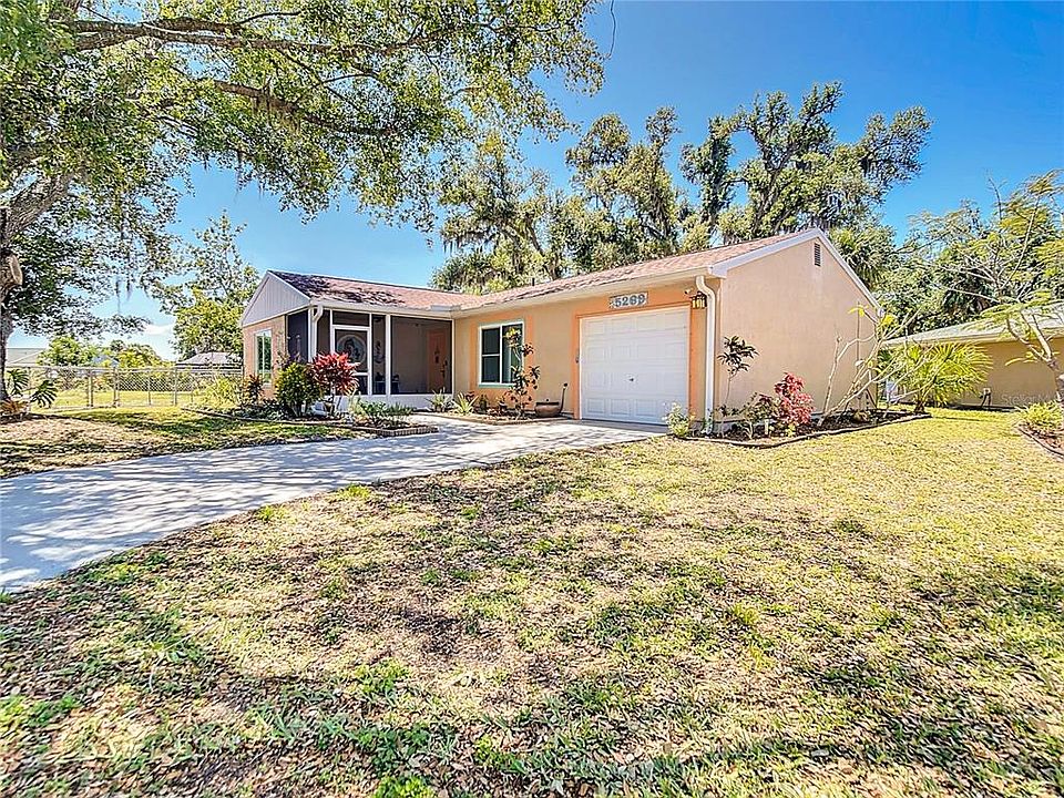 JUST REDUCED! Charming home and lovely yard to call your own. WOW! Under $300K, a true gem for your Florida get away or full time tropical oasis. A NEW ROOF in 2023, newly rescreened lanai, that is generous in size, with a wall mural enhancing the tropical feeling and overlooking the many plantings and mature foliage. Updated plumbing and some freshly painted rooms reflect the care and pride of home ownership. The three bedrooms and two baths offer options for guest space as well as home office or craft room use. The primary bedroom has an attached bath. The open plan combines the living area with the kitchen. A breakfast bar is a great spot to have a snack. The single car garage has extra outlets and an A/C vent, and is home to the laundry area. Once outside, the owners can delight in the lush shaded landscape and enjoy the tranquil surroundings. North Port has so much to offer, restaurants and entertainment is easy access. The shopping and beaches are close by, a nearby park even has a kayak launch, playground and courts for tennis or basketball. The famous Warm Mineral Springs Park is a local treasure. Cool Today ball park hosts spring training games and events. PLUS, Fishing, boating and sunbathing! OH MY!