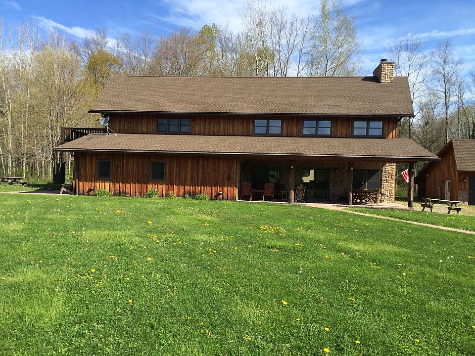 Contemporary, lodge style building situated on 86 acres along the snowmobile trail with 4 RV hookups, close to the Village of Bemus Point and Chautauqua Lake and Chautauqua Institution. Lower level has a great room complete with vaulted ceiling, large, wood burning fireplace, 17' wet bar with refrigeration, step down to a family-type room, open, kitchen with commercial Wolf, gas range, commercial Fridgedaire refrigerator, dishwasher and double sink, four bedrooms, 2 bathrooms, walk-in pantry, laundry room with stackable washer and dryer. The upper level has an open loft for added relaxing space, plus, two bedrooms and bathroom, with doors to exterior balcony. The multiple bedrooms and bathroom facilities will accommodate many for sleepovers or entertaining events. Added bonus of a 24' X 40' detached, 3-bay pole barn with back lean-to! Must see to appreciate!!