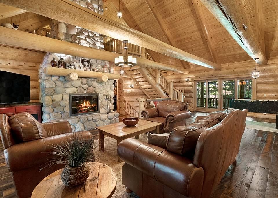 Peace and privacy begin at the gated entrance to this Scandinavian scribed full log home tucked into three wooded acres and adjacent to 1000's of acres of State Land. A crackling fire in the wood burning stone fireplace anchors the great room while log beams floating overhead keep the majestic vaulted ceilings of the kitchen and dining areas cozy and comfortable. Uniquely designed to bring the beauty of the outdoors in, there are exterior doors to either a covered porch or patio from every room on all levels, including the balcony off the upper bedroom. The rec room is designed for entertaining with an ample bar area and game room with split stone fireplace. Crafted with many luxury finishes such as granite kitchen and baths with custom tile work, Gaggenau double ovens, triple kitchen sink, warming drawer, wine fridge, accent lighting above and at the feet of cabinets, surround sound, home security and great attention to the details of design throughout. Making the setting complete is a must have 32x40 pole barn has a heated workshop and plenty of room all your storage needs.