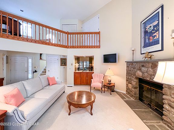 Immaculately-maintained, spacious 3 BR/2.5 BA, golf cottage fronting the famed Buck Hill Falls golf course. This lovely home boasts an open floor plan with double height ceiling in the main living area and a beautiful wood-burning stone fireplace. There is both a screened-in porch and an open deck to enjoy outdoor living and the gorgeous golf course views. The home features a first floor master suite, eat-in kitchen, new carpet, fully finished basement with two large rooms, a family room and large hobby room, an oversized two-car garage and a whole-house generator. There is room for the whole family and plenty of storage. This is a must see! Buck Hill Falls offers year-round amenities including 27 holes golf, tennis, pool and 4,500 private acres. Full club membership included in dues.