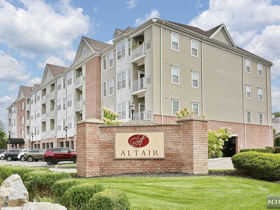 Beautiful 55+ active adult community located in the heart of Bergen County. Condo is in the newest building in Altair built in 2015. Hardwood floors through out. Kitchen has cherry cabinets, stainless appliances & granite counter tops with custom tile. Kitchen overlooks dining/living room with bay window. Ceiling fans in living room and bedroom. Dual entrance to balcony from living room and bedroom. unit has full size washer/dryer. Security system with camera to see who is coming to visit. Upgraded Walk-in-shower. Trash recycling located on each floor by elevator. Ground floor covered parking space with storage bin. Additional parking outside for guests. Easy access to all major highways. Clubhouse features library, card room, full kitchen, fireplace and exercise room. Heated outdoor pool and spa. Owners can rent clubhouse. Lighted walking paths surround entire community. Pets allowed under 30 pound. THIS IS A SMOKE-FREE COMPLEX.