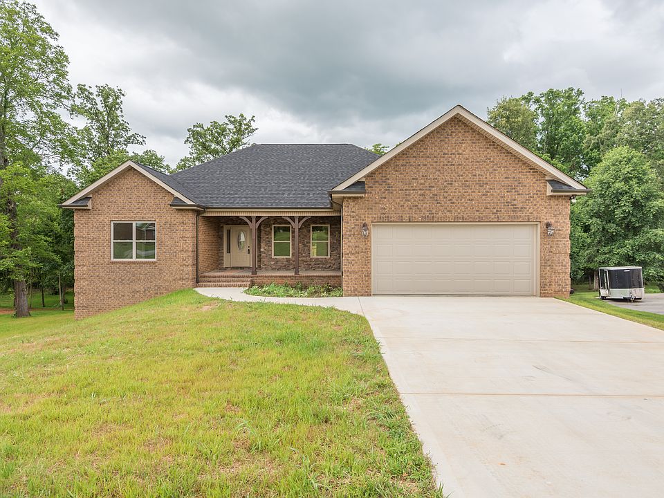THIS BRICK 3 BEDROOM BASEMENT RANCH HOME (WHICH IS ONLY 2 YEARS OLD) SITS ON 1.2 PRIVATE ACRES & SHOWS BRAND NEW!! LOCATED IN AN UPSCALE DEVELOPMENT THIS HOME FEATURES AMENITIES TO INCLUDE: OPEN FLOOR PLAN, WARM PAINT COLORS, SPLIT BR PLAN, RED OAK 3/4'' CUSTOM HARDWOOD FLOORING, OPEN GREAT ROOM (W/CROWN MOLDING, 10' CEILING, HARDWOOD FLOORS & STONE FIREPLACE), OPEN DINING ROOM (W/CROWN MOLDING, HARDWOOD FLOORS & 10' CEILING), OPEN KITCHEN (W/CROWN MOLDING, GRANITE COUNTERTOPS, STAINLESS FRIGIDAIRE APPLIANCES, HARDWOOD FLOORS, CUSTOM SOFT CLOSE CABINETRY & PANTRY WITH DRAWERS), BREAKFAST ROOM (W/HARDWOODD FLOORS), MASTER BEDROOM (W/TRAY CEILING & CROWN MOLDING), LARGE MASTER BATH (W/TILE FLOOR, TILE SHOWER.2 WALK IN CLOSETS, DOUBLE VANITIES & JETTED TUB WITH TILE SURROUND),HALF BATH