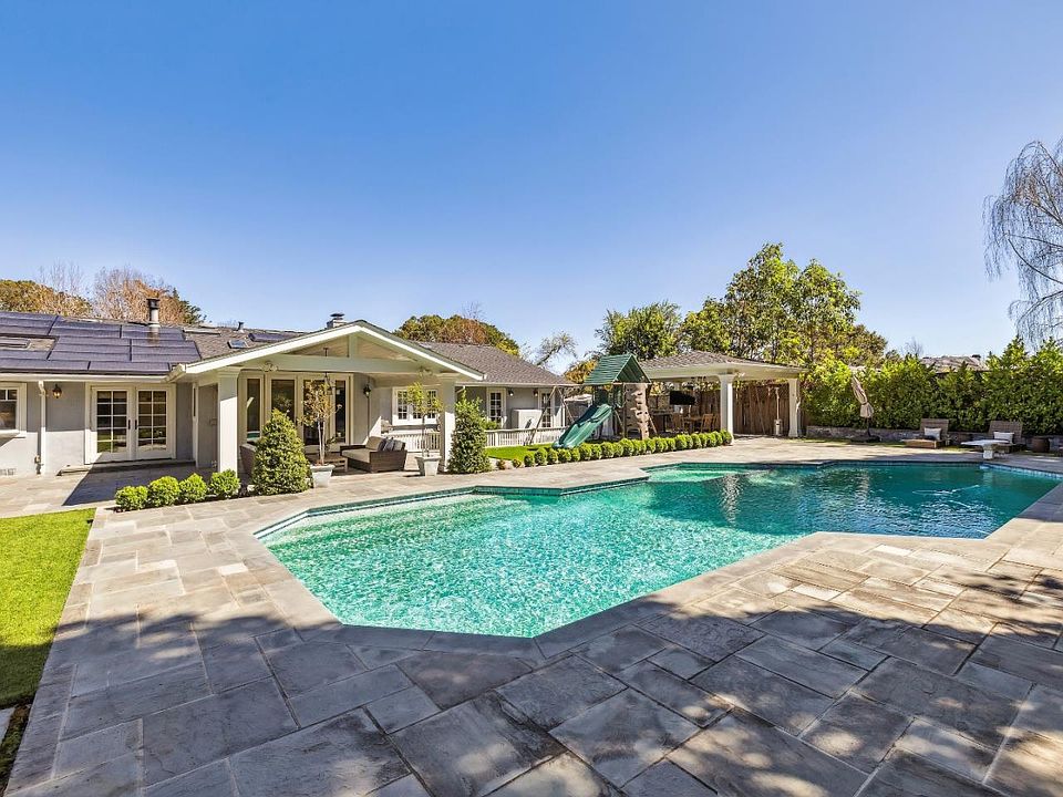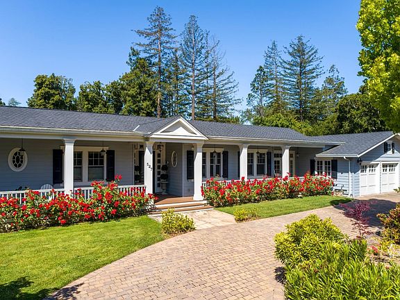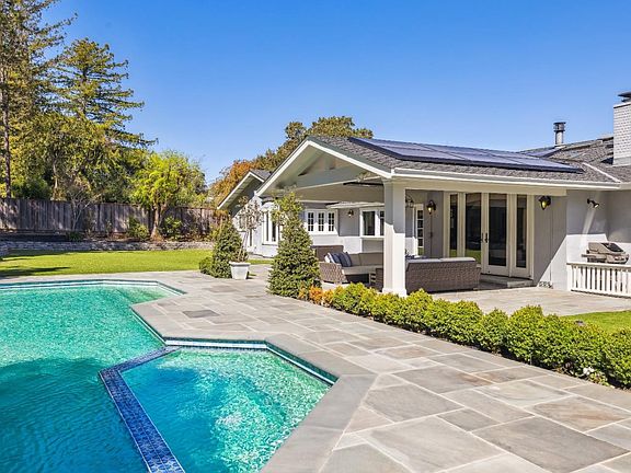 SUMMER BY THE POOL! With summer upon us, this is the resort retreat you want! Absolutely amazing yard like a five-star resort, completely flat with pool, spa, heated entertaining pavilions, gas fire pit, outdoor Sonos Sound, outdoor kitchen, playground, vast synthetic turf and more! *Solar powered house with 2 Tesla Powerwalls* Architecturally you are reminded of heart-warming Napa farmhouses, or Cape Cod vacation retreats...all flowing on one level from indoors to outdoors.... *5 bedrooms, 4.5 bathrooms, plus Large Office/Playroom* Incredible quality and handpicked character of the finest finishes* Every ceiling architecturally curated with stunning heights, crisp white woodwork, & Vantage lighting system. Open Kitchen/Family room with 11 ft. white marble island adjoins Family Room open to Flat Yard, *All bathrooms beautifully redone with white marble and fine finishes. Unique architectural ceiling treatments in each room, including a delightful children's loft that links two family bedrooms in the South Wing. Special features of huge Mud Room, Walk-in Pantry, Sonos inside & out, Wine Bar in Family Room, Undercounter Sub-Zero refrigerator drawers on island & more!* Very best street of Carolands, divinely flat & private, streaming with the sunshine of south and west exposures!