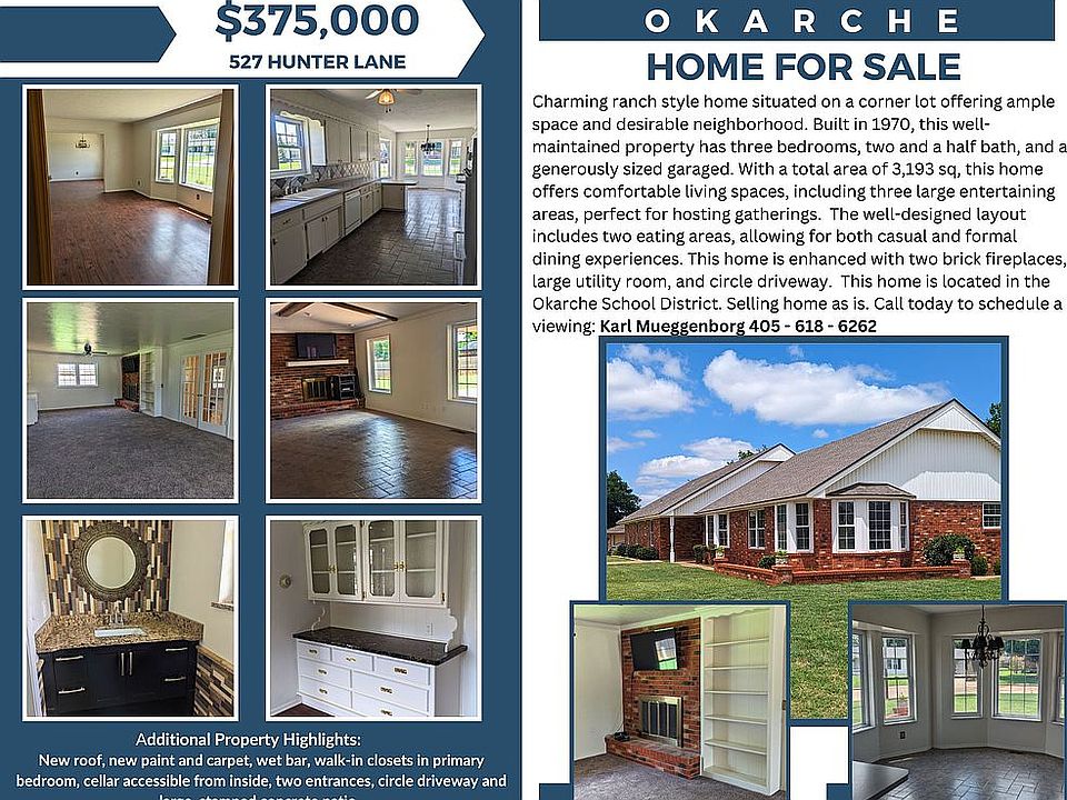 Charming ranch style home situated on a corner lot offering ample space and desirable neighborhood. Built in 1970, this well-maintained property has three bedrooms, two and a half bath, and a generously sized garaged. With a total area of 3,193 sq, this home offers comfortable living spaces, including three large entertaining areas, perfect for hosting gatherings. The well-designed layout includes two eating areas, allowing for both casual and formal dining experiences. This home is enhanced with two brick fireplaces, large utility room, and circle driveway. This home is located in the Okarche School District. Selling home as is. Call today to schedule a viewing: Karl Mueggenborg 405 - 618 - 6262