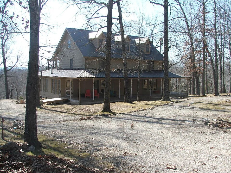 Beautiful 2 story plantation style home on 10 acres within minutes of the famous White River and Bull Shoals Lake! Many upgrades including kitchen cabinets, granite counter tops, jetted tub, etc. and the charm of this home will make you fall in love with it. Two bedrooms could be added in unfinished attic area. Wooded land fronts pavement and affords winter view of the White River. 30x40 Metal double garage/workshop.