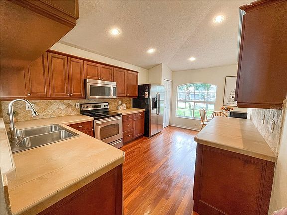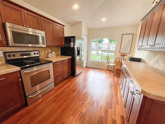 Sought out charming Lake Mary pool home in the desirable and well maintained Manderley community. This 4 bedroom 2.5 bathroom home is situated on over 1/4 acre fully fenced lot. The main floor is welcoming, and bright with an open Great room to the dining room and high vaulted ceilings. The kitchen offers a breakfast bar, stainless steel appliances, wood floors and cherry cabinets with ample cabinet space. In the primary bedroom you'll find a walk in closet, ensuite bath with a separate walk in shower, garden tub and double vanities with upgraded cabinetry, fixtures, and granite counter tops. There are 3 large bedrooms with upgraded closet spaces and a full bath upstairs. The enclosed pool enclosure was rescreened in 2021 and overlooks a spacious backyard. Newer roof, AC replaced in 2019, garbage disposal 2020 and exterior paint 2021. Just minutes from restaurants, shopping, majorhighways, and medical.