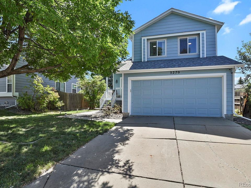 This warm and inviting home has a beautiful covered front porch and large shade tree in the front yard. Upon entering one will notice the engineered wood floors and designer paint colors and two large picture windows that let in abundant light in the family room. The main floor family room is open to the kitchen and the upstairs and has a vaulted ceiling. The kitchen has been updated with painted white cabinets, granite tile counter tops, and all the appliances are included. Off the kitchen there is a powder bathroom, the laundry closet and the door to the 2-car attached garage. Upstairs has the primary bedroom that has dual closets and an access door to the full bathroom. There are 2 additional bedrooms that are decent sized and have wood floors. Outside in the backyard there is a patio to enjoy the cool Colorado nights and a fenced in yard for playing yard games. Also, there is a garden area or it could be used as a dog run. There is a new 8x10 shed for additional storage that has been painted to match the house. The roof is about 5 years old and the home has a radon mitigation system. Additional storage in the garage or in the crawl space (access door is in the laundry room). Low HOA fees @ $55 per quarter and it includes the community pool, tennis courts, pickle ball courts, trails, trash and recycling. Sellers are including a 2-10 Supreme Home Warranty to cover the appliances and HVAC & plumbing systems in the home for 12 months after closing. Great single family home for a first time buyer!
