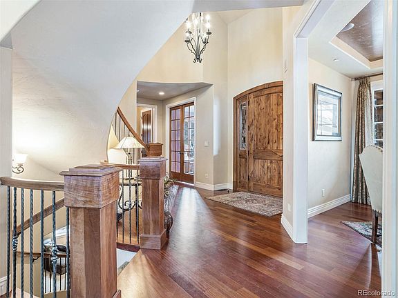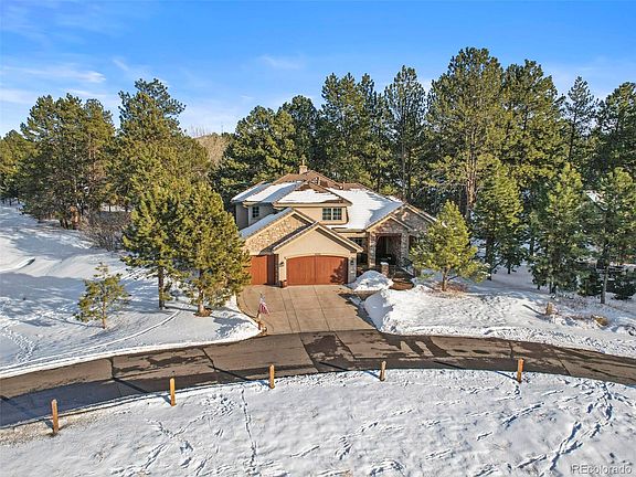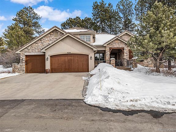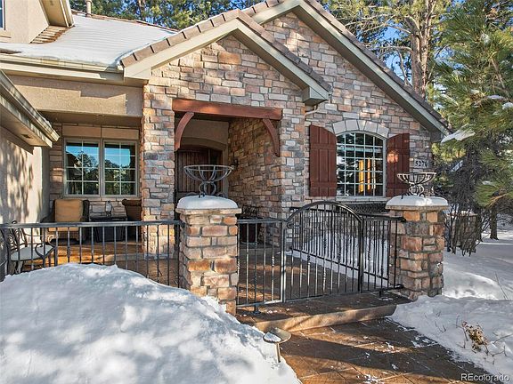 A tranquil setting highlight this wonderful Summit Chalet Home in The Village at Castle Pines. Nestled among a picturesque treed backdrop on a large private lot, this semi-custom two-story home is masterfully built, with a spacious main floor primary suite, beautifully appointed gourmet kitchen and three spacious bedrooms on the upper level. Throughout the home, walls of windows stream in loads of natural light, capturing the beauty of the home’s natural surroundings. Eye-catching wood and stone elements intermingle to evoke a sense of luxury and sophistication, and rich wood flooring adds warmth to every room. A charming wine cellar adorns the beautifully finished basement, which is generously sized for loads of storage, entertaining and relaxation. This sought after patio home includes a sub association that adds ease to your landscape maintenance.