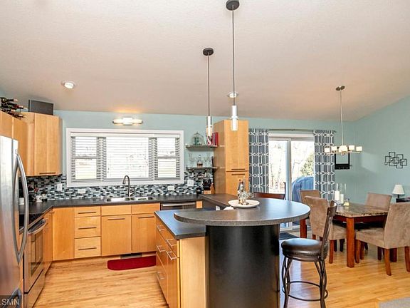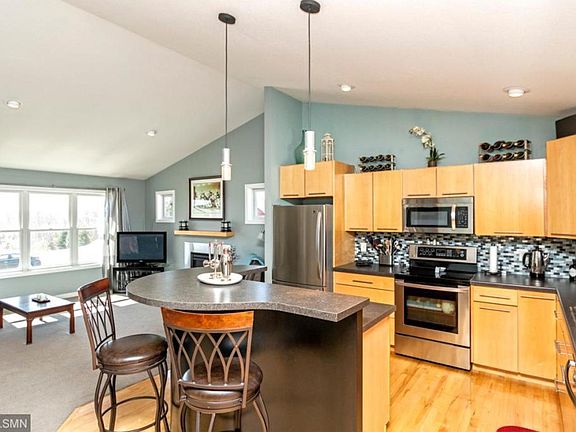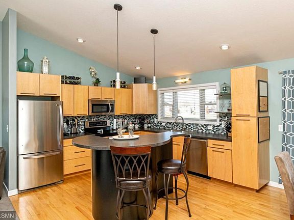 This 4 bedroom 2 bath home has an award winning contemporary floorplan. The kitchen has maple cabinets and stainless steel appliances. The main floor has an open design with dining area looking out to deck and 5 acre city park. The master bedroom has two walk-in closets and a passthrough to full bathroom. The lower level has a large family room with option for 2nd fireplace and a laundry room with window and room for storage. The fenced backyard is flat and has a storage shed.