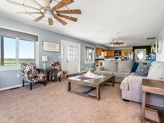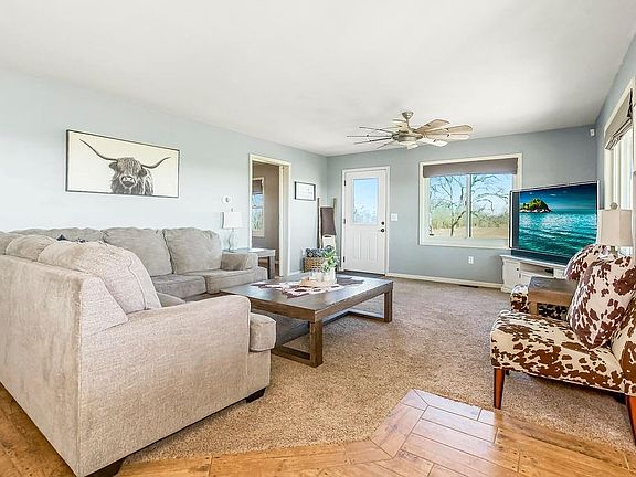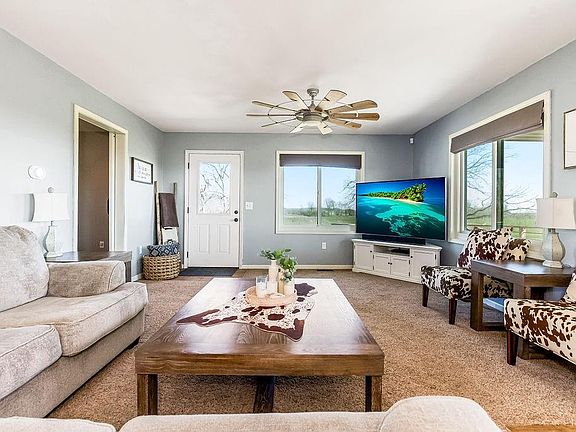 Welcome home to this remarkable property on almost 8 acres. Buyers will instantly fall in love with the hilltop views for miles in almost every direction. This one-of-a-kind ranch home has so much to offer! The open floor plan makes this home very inviting. From the minute you walk in you feel the warmth and specific touches the sellers have created to make this home welcoming. The kitchen has beautiful cabinets with enough space for kitchen prep, ample countertop space and storage for small kitchen appliances. The bar area can accommodate four barstools, and additional dining space big enough for a table. The living room can easily and comfortably accommodate a sectional or several couches and chairs. The east and south windows allow a great amount of natural light to the main floor living and dining spaces. The master bedroom boasts views of the east side of the property. The master bath is large, functional and has amazing character. The second bedroom and main bathroom is off the kitchen. Sellers have provided many upgrades including new windows, new trim, new doors, new interior paint, a security system plus new lighting and ceiling fans. Fiber internet is a plus for remote workers, or for families who stream or like to game.