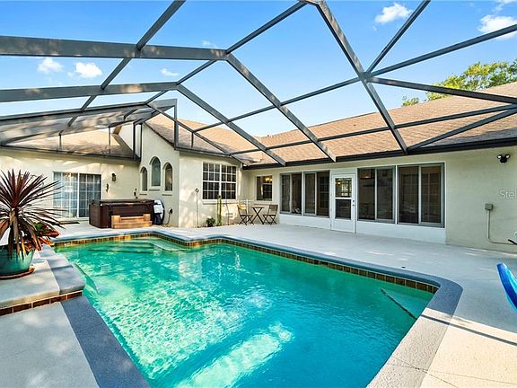 Wonderful opportunity for a 3/3 with over 2600 living square feet. This move-in ready Pool home with hot tub is ready for new owners. Property features 2 sides,each with complete kitchens and the 2nd has its own entry from an exterior side door with deck area and access out to the pool, too. The 2 sides are attached with a hallway but with doors that lock on either end, if desired. Lots of upgrades and updates done in the last few years including fresh neutral paint, all new fixtures and more. Home can be used as a 2/1 and a 1/1 for extended family/friends/guests to live independently or as a 3/3 with the hallway left open. Both Master suites have jet tubs for relaxing and there are 3 living areas to live, enjoy and entertain. There are 2 ACs and 2 Water Heaters, a 2 car extended garage plus an upgraded water purification and softener system (valued at over $3,000). In addition to the screened lanai and pool, there is an enclosed porch with glass windows that can be closed, open or removed for another great space and the huge completely fenced backyard boasts a beautiful firepit area and an 8 x 10 storage shed. This is a must see!