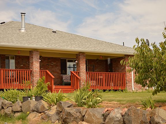 Almost 7 acres with water rights. Country living at its finest, nice brick home perched on a bluff overlooking WW Valley and the Blue Mtns. Country acreage with fruit trees planted and producing, peaches and apples plus garden spot. 30'x 50' shop building. Covered outdoor dining deck, facing S. toward Seven Hills and the Blue Mtns. Quality interiors of tile and wood and circle driveway. If country living is in your future,call today for your private showing.