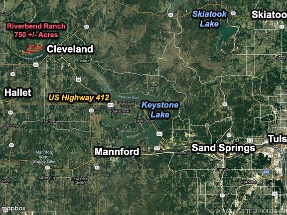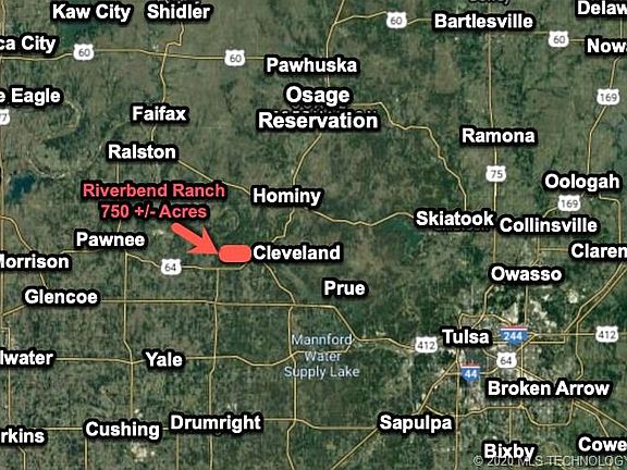 750 +/- Acres, Riverbend Ranch. A true once-in-a-lifetime opportunity. Properties like this rarely change hands, if ever. Hard pressed to find ground of this quality that is all adjoining with grass that is this productive. 4 highly productive water wells are strategically located to provide water to all pastures. SE 170 acres boasts sought after farm ground. Perfectly named as it abuts the Arkansas River on the bend just west of Cleveland. Great location, less than 50 miles to Tulsa. Walmart is nearby.