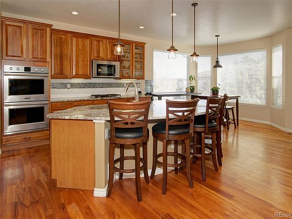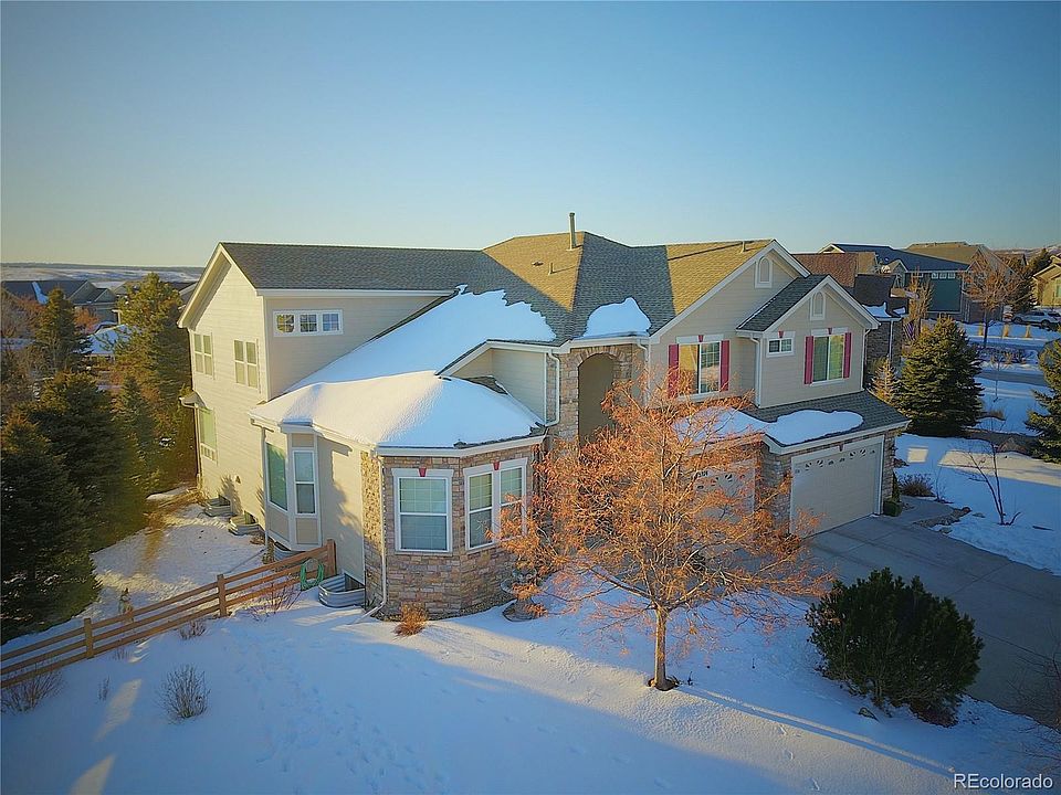 This rare main floor master two story home features a spacious gourmet kitchen with stunning granite slab counters, stainless steel appliances, gas cooktop, cherry cabinets w/ crown molding, an island, a walk-in pantry, and eat-in space/breakfast nook with bay windows. The great room has 20' ceilings, a gas fireplace, and the same cherry wood floors that run from the vaulted entry, through the entire kitchen to the tiled mud room/ laundry room. The master suite has vaulted ceilings, bay windows and a five piece bath with a two-sided fireplace, oval soaking tub, oversized shower w/ bench, a large walk-in closet, 18'' tile floors, private commode room, and beautiful granite slab counters. The main floor also has a study with French doors, a formal dining room, and a powder room/half bath. Upstairs you`ll find three more bedrooms - one with a private full bath and the other two with a full Jack & Jill - a huge loft/entertainment room w/ built-in cabinets, and another small loft space/reading nook. Can you believe you get this much house on a nearly half acre lot with mature trees and covered and uncovered patios in the lovely Pradera neighborhood in south Parker? It`s true! Come see it today.