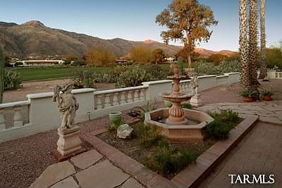 On the golf course in prestigious Skyline CC Estates w/spectacular golf course & sweeping Catalina Mtn views. Enter thru gated courtyard into great rm w/brick flrs, beveled glass skylights, custom plaster crown moldings, custom medallions made for the Getty Museum, french doors leading to patio w/sweeping mtn views. Light & airy, this open flowing floor plan features kitchen w/concrete tiles, travertine counters & crown moldings.