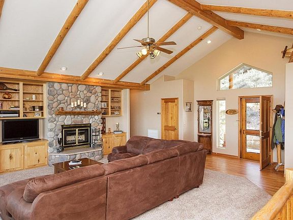 REDUCED OVER $100K! Owner is motivated. Four Ponderosa acres with stunning views. Stucco and peeled log exterior. Step inside to Oak Wood floors, peeled log beams in high ceiling, wall of windows to National Forest trees and SF Peaks! Deluxe kitchen and family style dining room, Beautiful Living Room with Fireplace and freshly recarpet and paint. Main Level Master Suite with three total BR and two and a half Baths Upstairs and two bedrooms/one bath Downstairs off spacious family room. Extra Bonus Room not in Sq. Ft. (800+-s.f.) for indoor hobby room, shop....?) Full Length Trex Deck off main level with forever views. Front Porch will greet and bid farewell to all your many friends coming to visit this gorgious retreat! Must See!