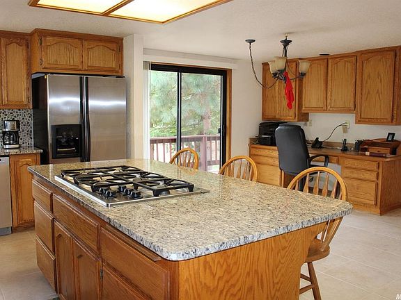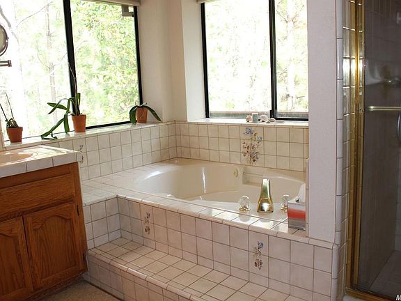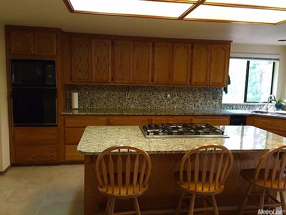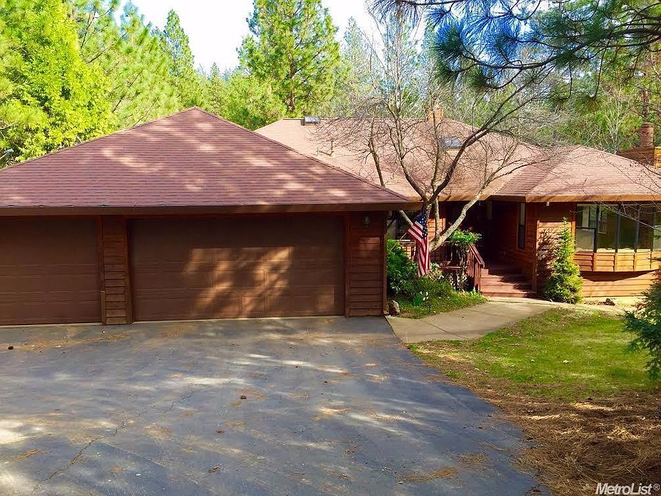 Like living in a treehouse! On 3 gentle,all usable acres with lots of trees. Kitchen has new tile,gas 5-burner Dacor cooktop,and a built-in office desk. A connecting family room is great for visiting, and keeping warm in the winter by the Vermont Castings woodstove. Decks on bottom and main floors, with numerous sliding doors. New carpets. Room to have both an office and a hobby room, or extra bedrooms.The trees have magnificent fall & spring colors. Private, yet easy access to Sly Park Road.