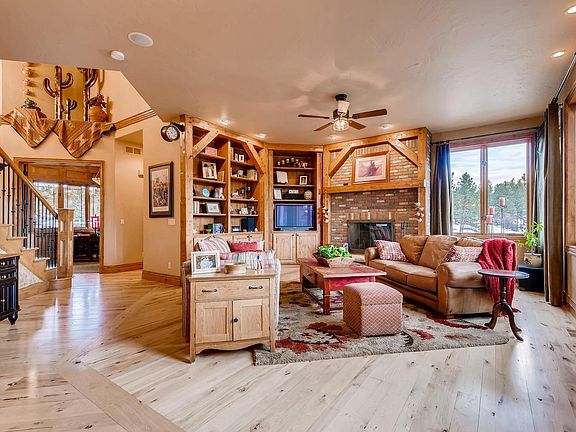 This home sits on a peninsula lot that backs to a hundred acre greenspace. Professionally landscaped with 2 water features and an invisible fence. The north side driveway pad is heated and the 4 stall garage has floor drains. The deck includes a built in Weber grill (6 burner with sear and rotisserie) as well as a gas fire pit. The home is well built with a concrete title roof and aluminum clad wood windows by Weathershield. Custom alder cabinets, doors and trim thought out plus wide plank hickory flooring with a commercial grade finish. The beams on the fireplace and bookshelf are hand hewn local larch (deciduous pine) done in Masonville, CO with mortar tenon joinery. Kitchen details include a custom copper sink, slab granite, with KitchenAid refrigerator and microwave, Dacor double ovens & warming drawer, Wolff 5 burner gas cooktop and a Bosch dishwasher. The copper hood and backsplash in the butler's pantry was designed by Denver artist Keith Chew. This custom home has every detail!