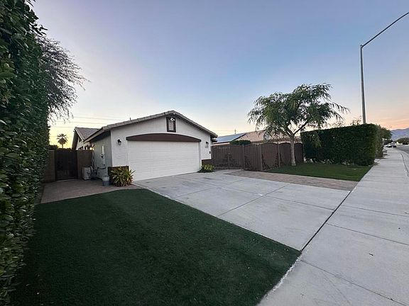 Welcome to Puesta Del Sol, an amazing neighborhood in the City of Coachella. This one of a kind home features 3 bedrooms 2 baths. This home is move-in ready with several upgrades throughout the house. The entire house is surrounded with ficus trees providing great privacy and shielding from the dust. A lovely courtyard entryway makes this home perfect and safe for a family with young children and pets. The garage has built-in storage cabinets. Walls and ceiling are sealed for a potential 4th room. Kitchen has brand new counter tops. The primary bedroom has a custom built closet with great storage. The backyard has a brick and covered patio. Along the patio are the drains which are perfect for those sudden rain storms. No flooding or water coming into the house! In the backyard is also a shed that already has connections to the A/C. This home is definitely a must see! Come see this amazing home for yourself!