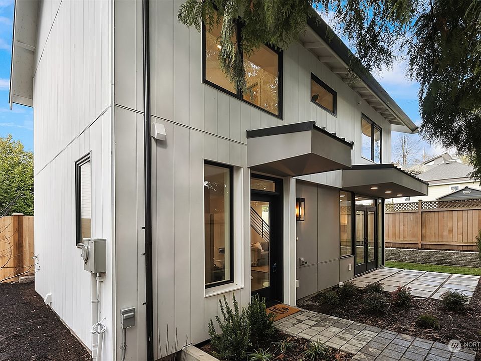 Limelite Development creates a striking new home. Detached and set back from the street, a well-positioned property offering privacy while maximizing sunlight and the surrounding greenery. Cedar arches lead you to gated entry with paver patios and low maintenance landscaping. Welcomed by carefully considered design that combines classic aesthetic with modern nuance, creating a sophisticated and effortless style. Main levels open living, built-in seating, mudroom, floating shelves and concrete floors blends fashion and function. Escape to the upper level where privacy and greenery is the piece de resistance. Primary with vaulted ceilings/ skylights, modern bathroom and guest bedroom with built-in study/work nook. Excellent Leschi location.