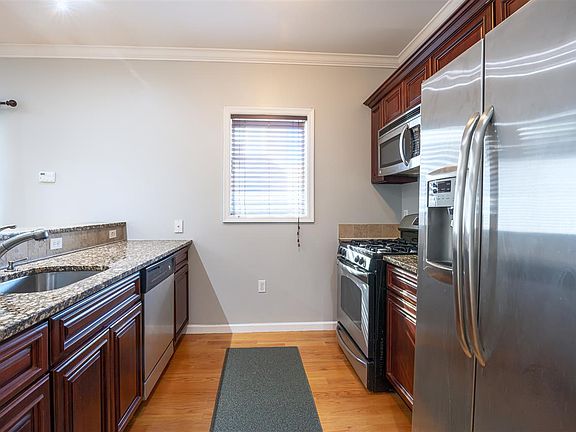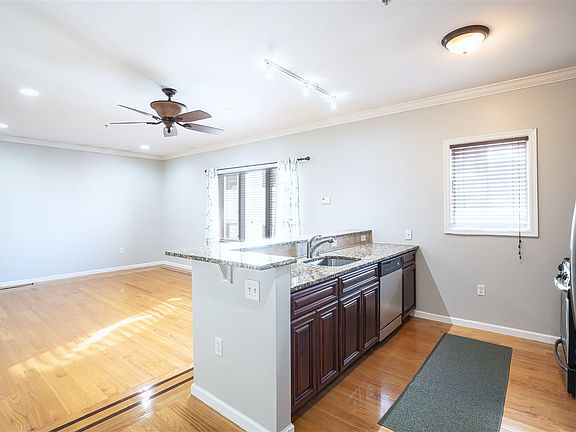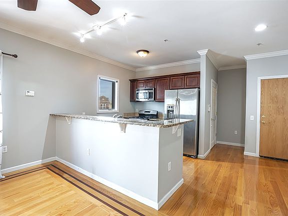 Freshly painted, move-in ready!! Spacious One-bed with washer/dryer in unit, independent HVAC heating/cooling system, Included amenities; a modern elevator in building, deeded parking spot in a covered parking garage (Included garage door opener.). Low property tax ad HOA. Bonus storage area for this corner unit. 20 Mins bus ride to NYC, and 3 blocks away to light rail connecting to the ferry/path. Additional municipal parking across the street.