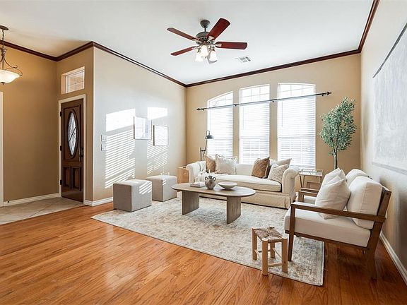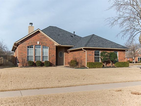 Take a look at this well-maintained home situated on a corner lot and nestled in the picturesque, tree-lined Cambridge Addition! As you enter the home, you'll be greeted by soaring 10-foot ceilings and large windows that fill the living, dining, and kitchen areas with natural light, creating a sense of spaciousness beyond its footprint. The heart of the home features a double-sided gas log fireplace, seamlessly connecting the living and dining spaces. The kitchen is thoughtfully designed, featuring granite countertops, stainless steel appliances, a built-in pantry for ample storage, and a convenient breakfast bar. Retreat to the oversized primary suite, which offers a private oasis complete with an ensuite bath featuring a large soaking tub, a walk-in shower, dual vanities, and an expansive walk-in closet. The generously sized secondary bedrooms provide ample closet space and share a well-appointed hall bathroom. Storage is abundant throughout, with two hallway closets and an additional coat closet. The utility room adds to the home's functionality with built-in cabinetry and a sink. Step outside to the fully fenced backyard, a perfect space for gatherings or play. Relax on the covered back patio overlooking the serene outdoor space, or take advantage of the neighborhood's amenities, including scenic walking trails, a tranquil lake for private fishing, and a beautiful park with soccer nets, basketball court and playground -- just steps from your front door. Ideally located just minutes from shopping, dining, I-35, and the highly sought-after Norman schools, this home truly has it all. Recent updates include a hot water tank replacement in 2020, new roof and gutters installed in 2022 and new fencing that was replaced and stained in 2023. Schedule your showing today to experience everything this remarkable home has to offer!