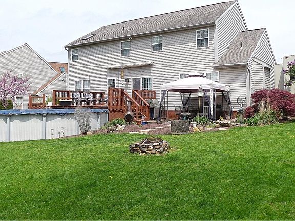 *1 Year Buyer's Home Warranty!* Nicely Appointed?the open floor plan with special touches will make this one your favorite! 2-story foyer welcomes guests with its pleasing d~cor, Palladian window at ceiling line, and staircase with open hall above. Corner ornaments at entry to the living room and dining room both completely open to each other. Generously sized living room with Brazilian mahogany hardwood flooring flows into the graceful dining room featuring tray ceiling, decorative corner blocks at crown molding and chair rail molding. A few steps into the cherry kitchen enjoying fireside views from the impressive family room! Granite counter on island with seating, as well as dining area at sliding glass doors to deck. Finished lower level for recreation, plus unfinished portion for mechanicals and storage. Upper level laundry room is very convenient for the private Master incorporating lots of closets, double maple vanity, tile surround jetted tub and walk-in shower, plus three additional bedrooms with hall bath. Wonderful Neighborhood & Outdoor Living...established landscaping around this home includes flowering trees, shrubs and privacy pines. Level grounds with areas for lawn games, fire pit, crushed stone patio next to stamped concrete patio and fish pond. The sizable deck directly accesses the pool!