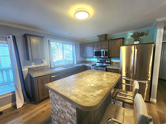 - Features: Breakfast Bar, Breakfast Area, Kitchen Island, Stainless Steel Appliances, Solid Surface Counters