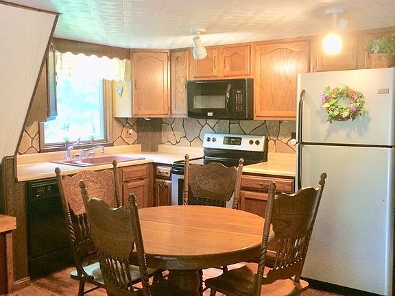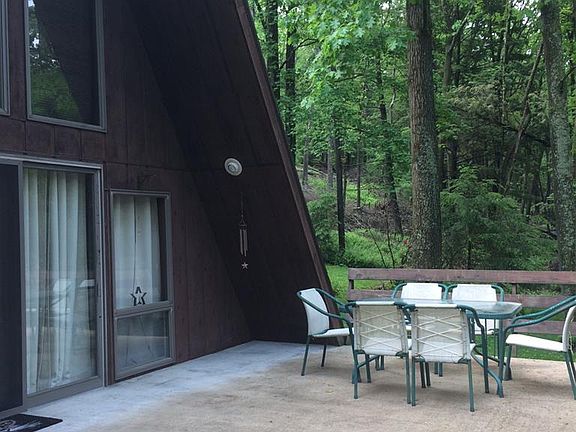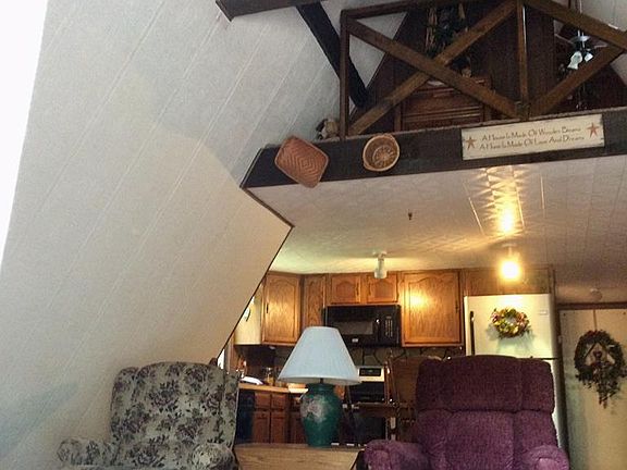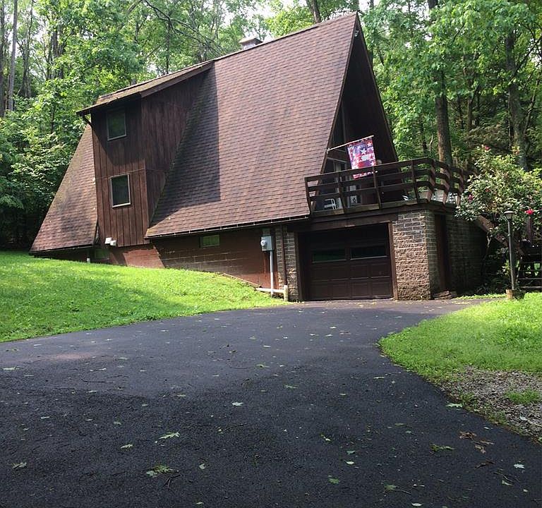 Well kept and very secluded A-frame... Great as a residence or a second home.. This house has a newer roof (2012). and a fireplace, wood stove in basement just needs hooked up again.. to keep costs low... Just revel in the decks with your coffee and relax ... one on front of home, looking out to nothing but woods on all sides, and two smaller decks off downstairs, and off upstairs bedroom....Rustic charm thru out... loft off upper bedroom, master bath just off that bedroom, Main bedroom has bath, with tub only, only across the hall.. and a very nice living area with fireplace, and kitchen... built in microwave, dishwasher, refrigerator, range, all in great shape... newer laminate flooring in kitchen and down hallway... The driveway is black topped and done on about 1/2 the drive, and this also sports a garage right off basement.. Basement has the washer and dryer and heated and presently has a sofa bed . There is a nice workshop on basement level and loads of storage .a.must see !