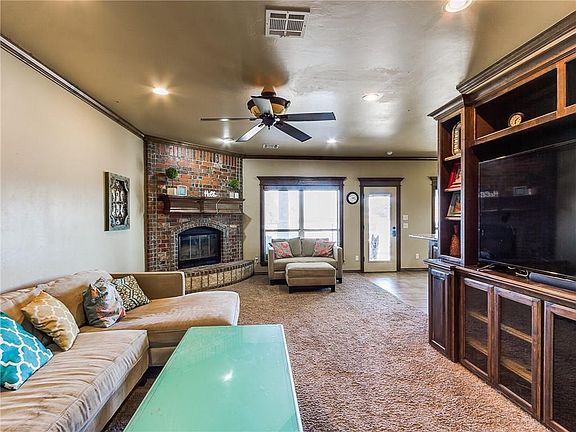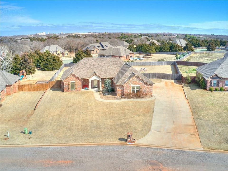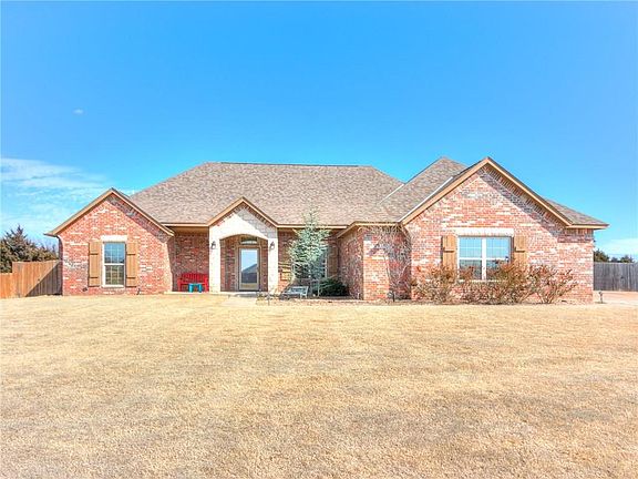 Sellers said get it sold, check out the new price. Come look at this beautiful home in Cedar Lake Estates on almost 3/4 acre. Walking in you will see a gorgeous wooden barrel ceiling in the foyer. This home is a true 4 bedrooms plus a study with 3 full bathrooms. Great floor plan with granite throughout the home, a large bar area in kitchen and plenty of counterspace and storage. Kitchen over looks the large dining area. Crown molding and beautiful wood built-ins throughout the home. There are gas/electric connections for the stove and dryer. Sprinkler system in the front and backyard. Garage is oversized, will fit a full size crew cab truck, and extra wide driveway. Security system with two cameras. Nice covered patio for entertaining with family and friends. Close to I-35 for commuting the OKC and surrounding areas. Schedule your showing today, don't miss out on this beautiful home.