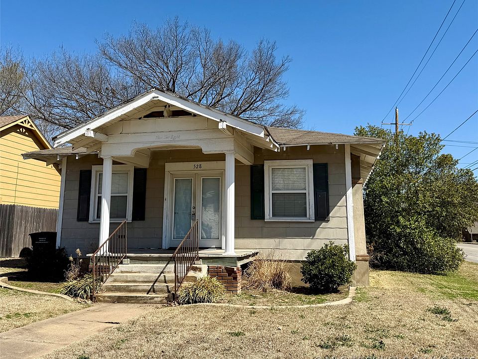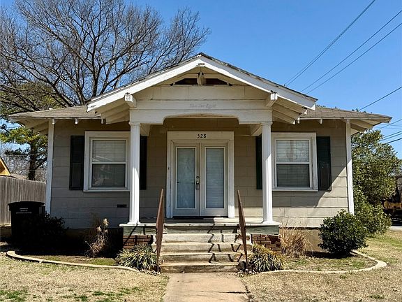 Adorable bungalow in the heart of Bartlesville! Covered front porch. Living area and dining area with newer carpet. Vinyl windows. Nice back yard with 2 car detached garage and alley access.