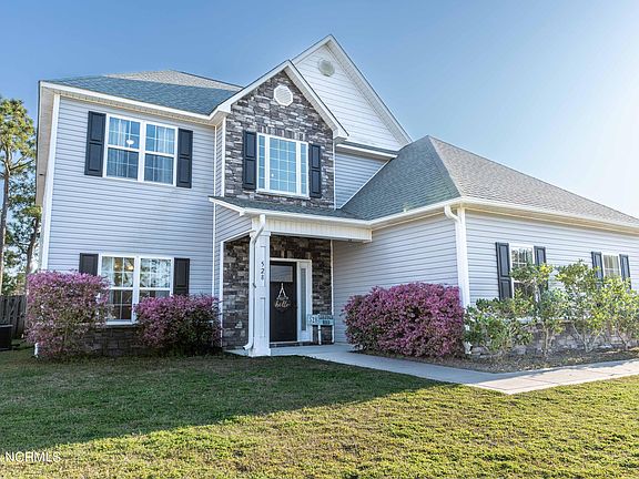 This immaculate home located just minutes from the beach and near Courthouse Bay and Camp Lejeune features 4 bedrooms and 2.5 bathrooms at approximately 2,618 heated square feet. Situated on a gorgeous lot, the curb appeal is exquisite! Easy to -maintain vinyl siding, accented by stone. All surrounded by a sodded yard with a clean, classic landscape. The grand foyer welcomes you in, opening to the formal dining room - perfect for hosting those special occasions! The chef in the family is sure to fall in love with the kitchen! Open and spacious with an ample amount of cabinet and counter space, a bar for extra seating, stainless smooth-top range, microwave hood, and dishwasher. Enjoy your morning coffee in the breakfast nook with the built-in bench with storage.